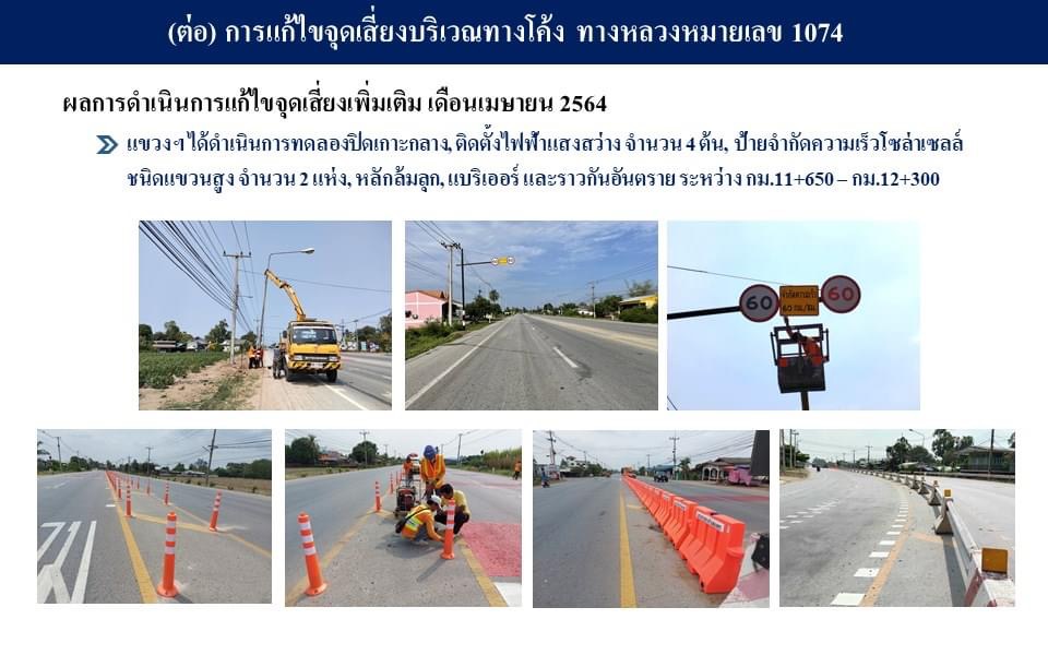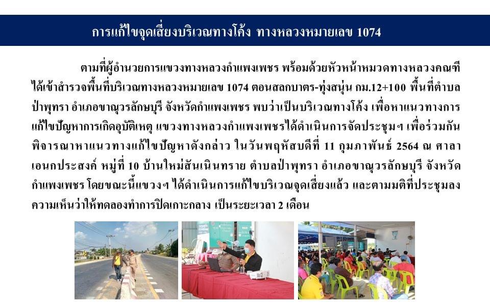 นายชัยศิริ ผูกใจเพื่อน ผู้อำนวยการแขวงทางหลวงกำแพงเพชร มอบหมายให้หน่วยงานในสังกัดดำเนินการแก้ไขจุดเสี่ยงบริเวณทางโค้ง ทางหลวงหมายเลข 1074 ตอนสลกบาตร – ทุ่งสนุ่น ระหว่าง กม.11+650–กม.12+300 ท้องที่ตำบลป่าพุทรา อำเภอขาณุวรลักษบุรี จังหวัดกำแพงเพชร เพื่อลดการเกิดอุบัติเหตุ โดยแขวงฯ ได้ดำเนินการติดตั้งไฟฟ้าแสงสว่าง จำนวน 4 ต้น, ป้ายจำกัดความเร็วโซล่าเซลล์ชนิดแขวนสูง จำนวน 2 แห่ง, หลักล้มลุก, แบริเออร์,ราวกันอันตราย, ตีเส้นชะลอความเร็ว (OSB), ตีเส้นพื้นถนนสีแดง (Anti skid), ตีเส้นข้อความ ลด ความ เร็ว (Marking) และทำการทดลองปิดเกาะกลาง ในลำดับต่อไปแขวงฯ จะมีการดำเนินการแก้ไขจุดเสี่ยงบริเวณดังกล่าวเพิ่มเติม ได้แก่ ติดตั้งแบริเออร์คอนกรีตอีก จำนวน 50 อัน และติดตั้งเสาราวกันอันตรายเพื่อเสริมความแข็งแรง และป้องกันอุบัติเหตุที่อาจเกิดขึ้น