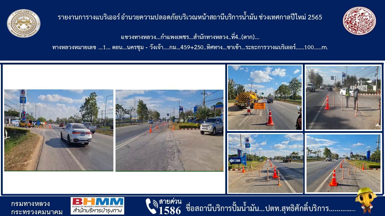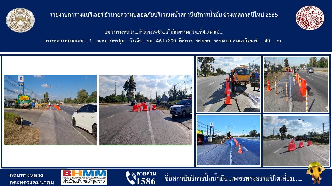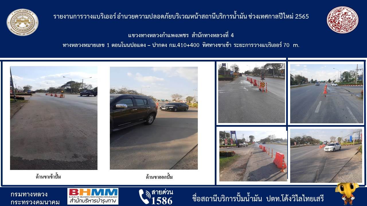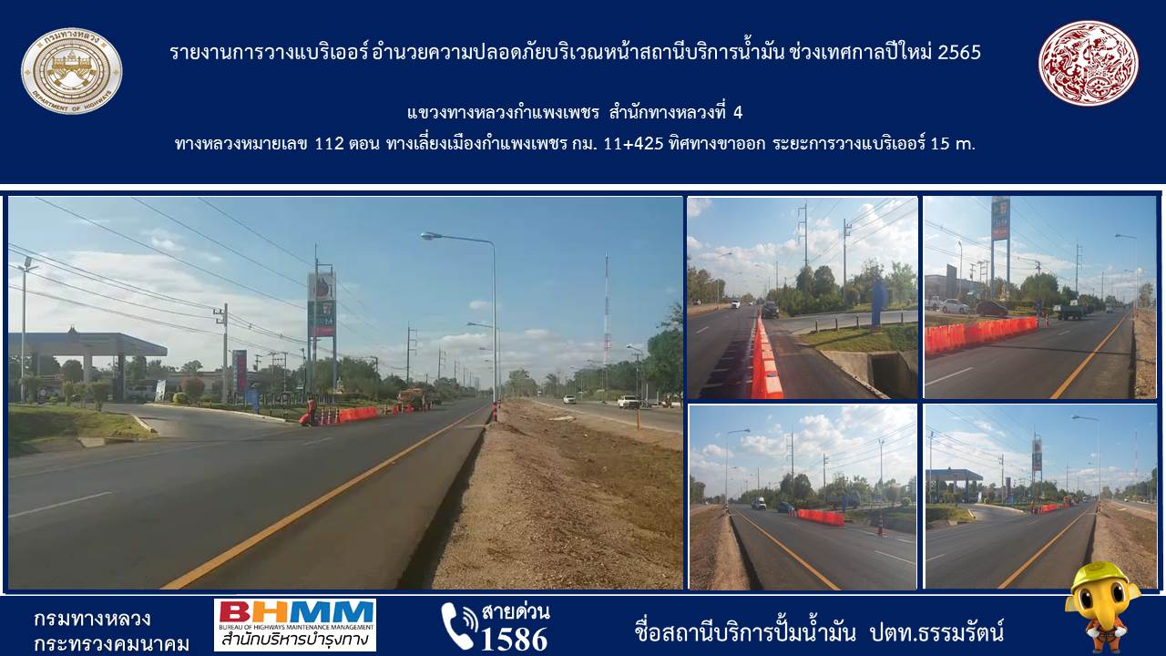 แขวงทางหลวงกำแพงเพชร โดยหมวดทางหลวงคลองขลุง, หมวดทางหลวงนครชุม, หมวดทางหลวงโกสัมพีนคร และหมวดทางหลวงบ่อทอง ดำเนินการติดตั้งแบริเออร์พลาสติก บริเวณหน้าสถานีบริการน้ำมันจำนวน 6 แห่ง เพื่ออำนวยความสะดวกให้กับประชาชนผู้ใช้เส้นทาง ในช่วงเทศกาลปีใหม่ 2565 ดังนี้