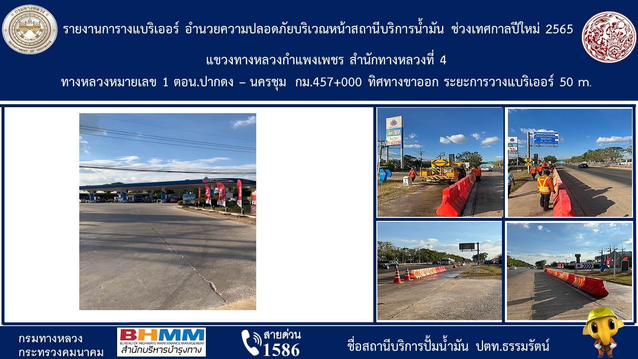 แขวงทางหลวงกำแพงเพชร ดำเนินการติดตั้งแบริเออร์พลาสติก บริเวณหน้าสถานีบริการน้ำมันจำนวน 6 แห่ง เพื่ออำนวยความสะดวกให้กับประชาชนผู้ใช้เส้นทาง ในช่วงเทศกาลปีใหม่ 2565