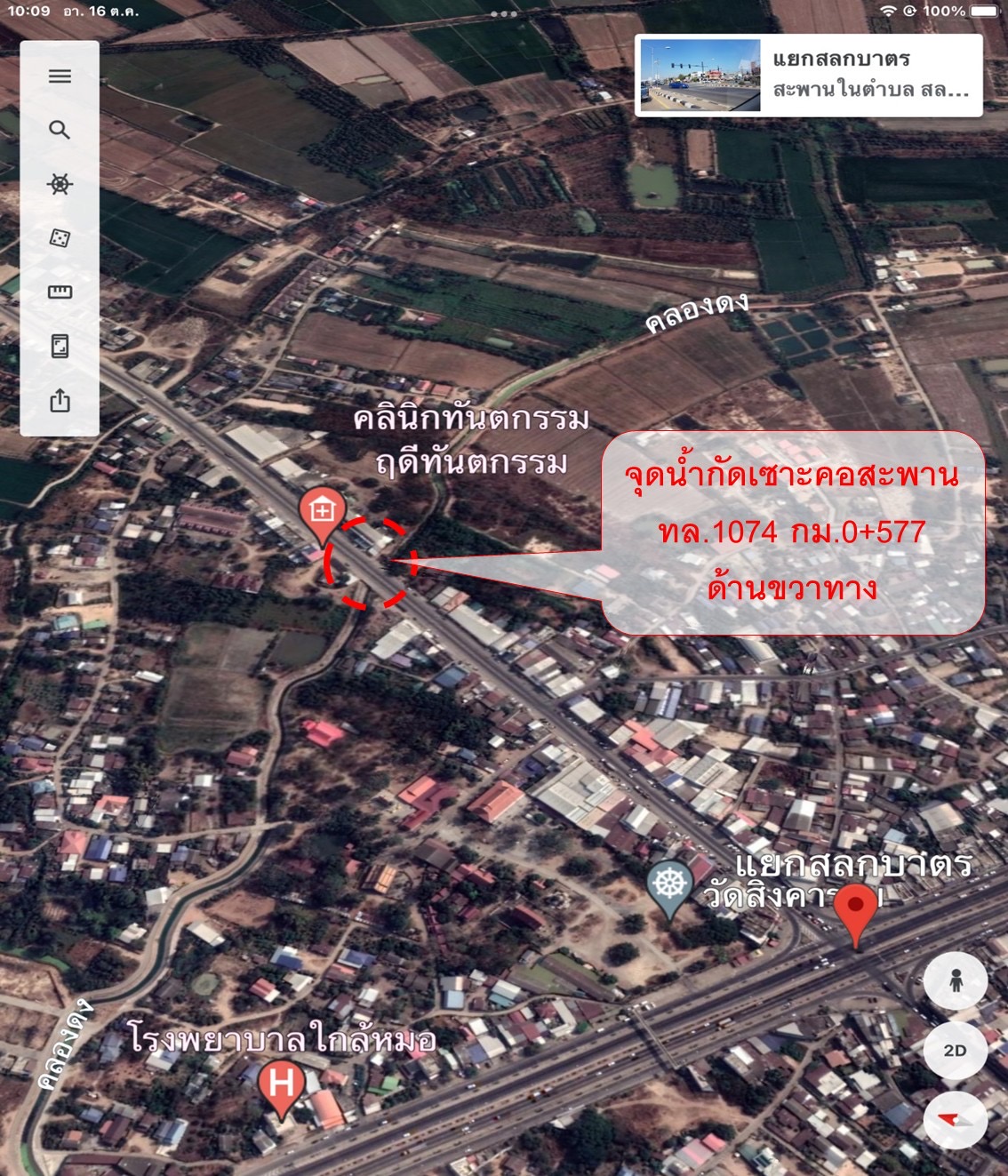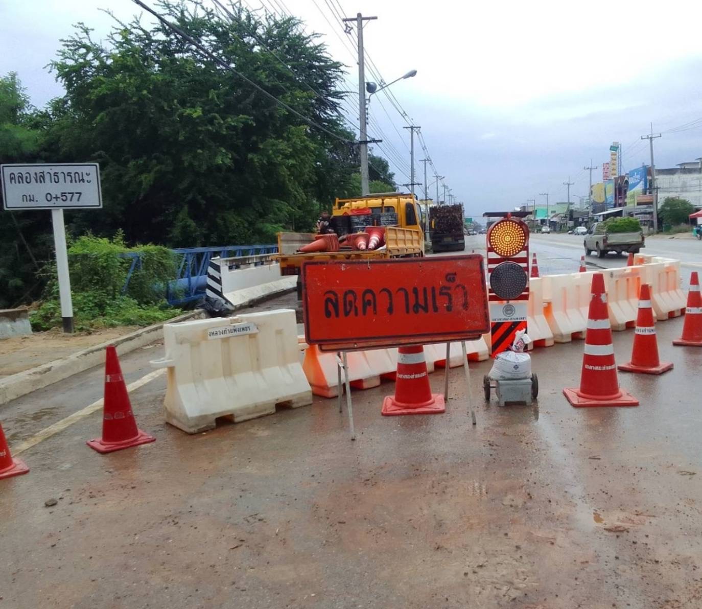 ด้วยเมื่อวันเสาร์ที่ 15 ตุลาคม 2565 บริเวณสะพานคลองสาธารณะ ที่ กม.0+577 ทางหลวงหมายเลข 1074 ตอนสลกบาตร-ทุ่งสนุ่น ท้องที่ บ้านสลกบาตร ต.สลกบาตร อ.ขาณุวรลักษบุรี จ.กำแพงเพชร เกิดเหตุน้ำกัดเซาะคอสะพาน ทำให้โครงสร้างทางและผิวทางบริเวณคอสะพานด้านขวาทางได้รับความเสียหาย แขวงทางหลวงกำแพงเพชร ได้ดำเนินการแก้ไขเพื่อไม่ให้ทางขาดโดยการนำวัสดุถมซ่อมแซม บริเวณคอสะพาน ขณะนี้ช่องจราจรด้านขวาทาง 1 ช่องทาง ไม่สามารถเปิดให้การจราจรผ่านได้ปกติ เจ้าหน้าที่หมวดทางหลวงคณฑี ดำเนินการติดตั้งป้ายเตือนและอุปกรณ์อำนวยความปลอดภัย พร้อมจัดเจ้าหน้าที่เฝ้าระวังฯบริเวณทีเกิดเหตุ จึงขออภัยในความไม่สะดวก และโปรดใช้เส้นทางด้วยความระมัดระวัง