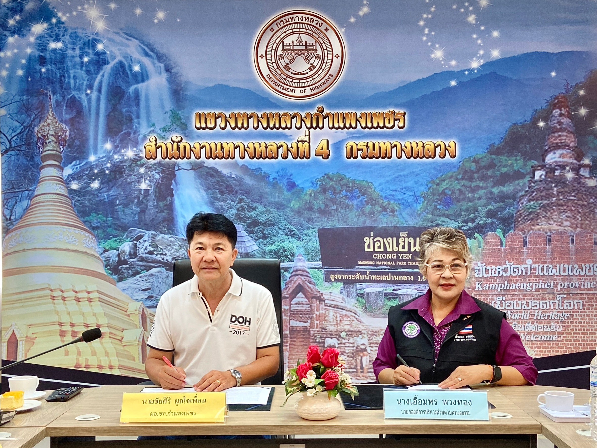 นายชัยศิริ ผูกใจเพื่อน ผู้อำนวยการแขวงทางหลวงกำแพงเพชร พร้อมด้วยนางเอื้อมพร พวงทอง นายกองค์การบริหารส่วนตำบลทรงธรรม ได้ร่วมกันจัดทำและลงนามบันทึกข้อตกลง (MOU) โครงการปรับปรุงบริเวณริมถนนในเขตทางหลวงและขอบสระบริเวณที่ดินสงวนของกรมทางหลวง ในเขตทางหลวงหมายเลข 1 ตอนนครชุม–วังเจ้า ระหว่าง กม.464+920 – กม.465+220 (ด้านขวาทาง) ท้องที่ตำบลทรงธรรม อำเภอเมืองกำแพงเพชร จังหวัดกำแพงเพชร ในการให้องค์การบริหารส่วนตำบลทรงธรรม เข้าไปปรับปรุงดูแลรักษาบริเวณดังกล่าว ให้เป็นพื้นที่สีเขียว เพื่อลดมลพิษจากการจราจร และเพื่อเป็นการอำนวยความสะดวกต่อการพัฒนาคุณภาพชีวิตของประชาชน ณ ห้องประชุมสำนักงานแขวงทางหลวงกำแพงเพชร