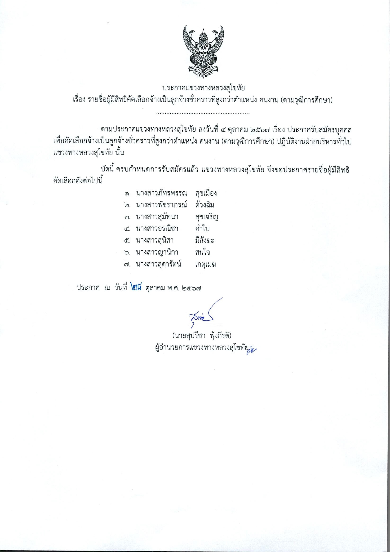 7 28/10/2567 วันจันทร์ที่ 28 ตุลาคม 2567 ประกาศรายชื่อผู้มีสิทธิ์คัดเลือกจ้างเป็นลูกจ้างชั่วคราวที่สูงกว่าตำแหน่ง คนงาน (ตามวุฒิการศึกษา)