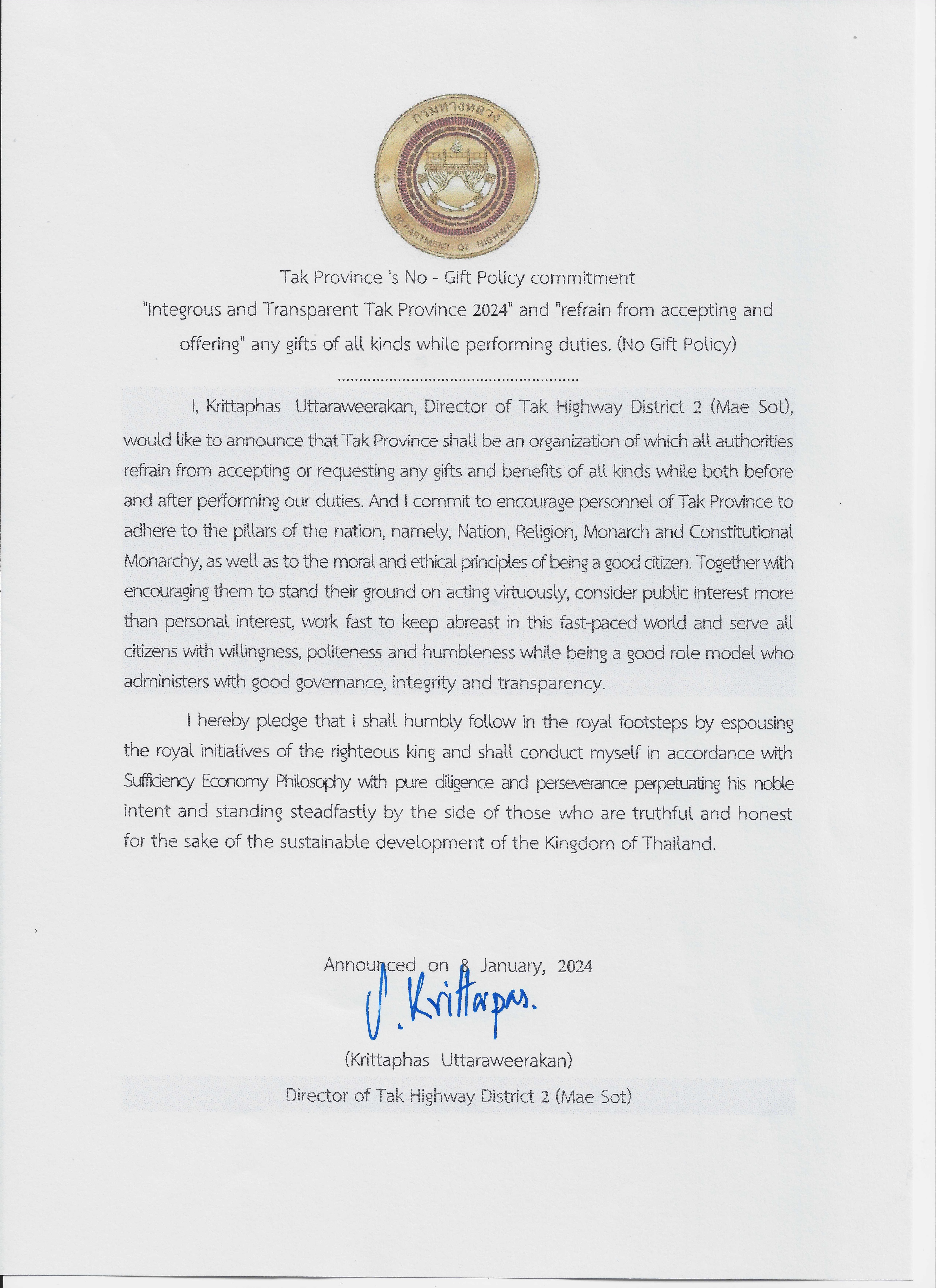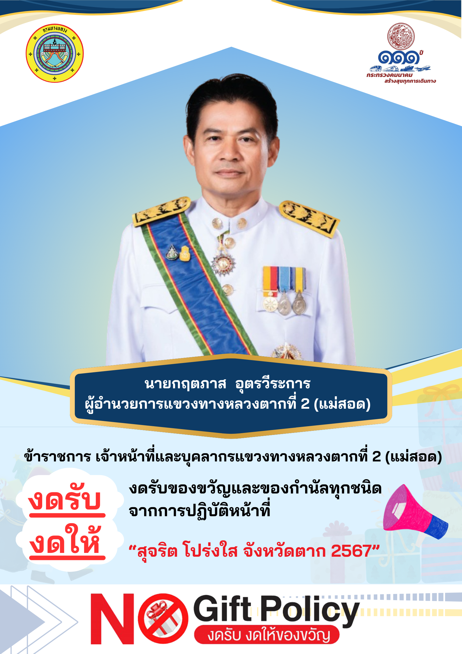 นายกฤตภาส อุตรวีระการ ผู้อำนวยการแขวงทางหลวงตากที่ 2 (แม่สอด) พร้อมด้วยข้าราชการและเจ้าหน้าที่ในสังกัดแขวงทางหลวงตากที่ 2 (แม่สอด) ประกาศเจตนารมณ์ "สุจริต โปร่งใส จังหวัดตากใสสะอาด 2567" ตามนโยบาย งดรับ งดให้ของขวัญ รวมถึงผลประโยชน์อื่นใดจากการปฏิบัติหน้าที่ ทุกเทศกาลและทุกโอกาส